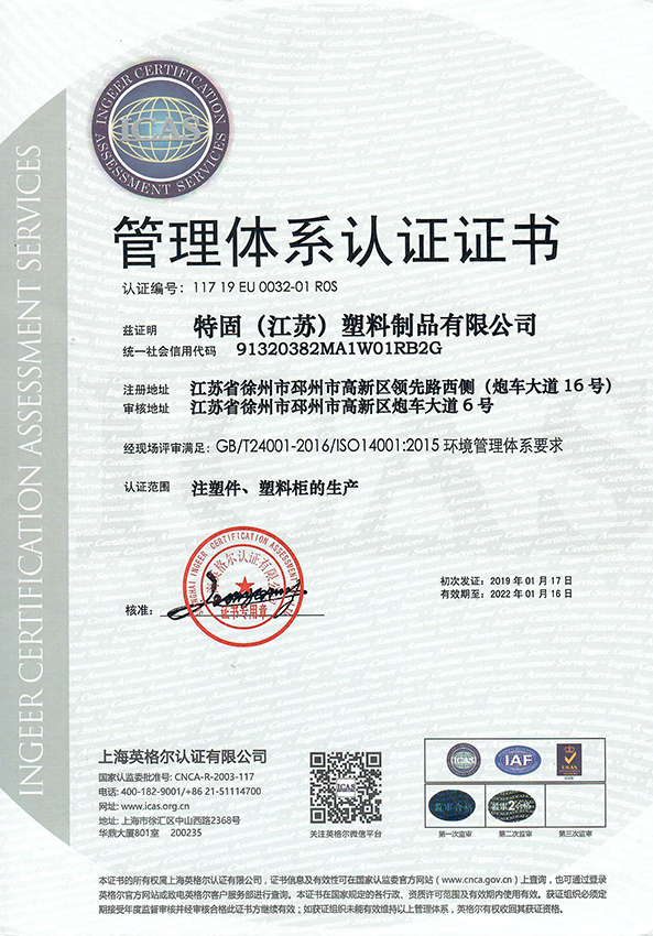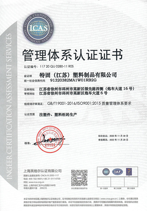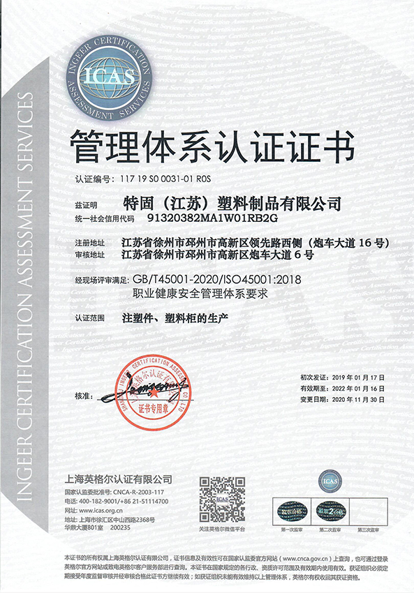 2018年特固工廠坐落于江蘇省徐州市邳州高新區炮車大道6號,全國18家特固分公司,工廠占地面積60000平方米,擁有6棟廠房,注塑機共15臺,員工人數50余人,每年生產和銷售置物柜數量超過40萬門,更衣柜產品的年銷售額超過8000萬元。已通過ISO9001質量管理體系、ISO14001環境管理體系、ISO28001職業健康管理體系!